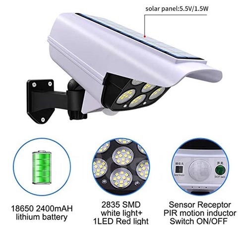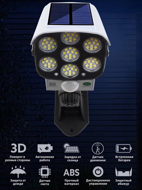 Изюминка Solar Sensor Light в схожести с камерой видеонаблюдения. Такой фонарь одним видом отпугнет воров. Автоматическое включение: датчик движения PIR может сканировать источник тепла, который непрерывно перемещается в пределах диапазона обнаружения.
